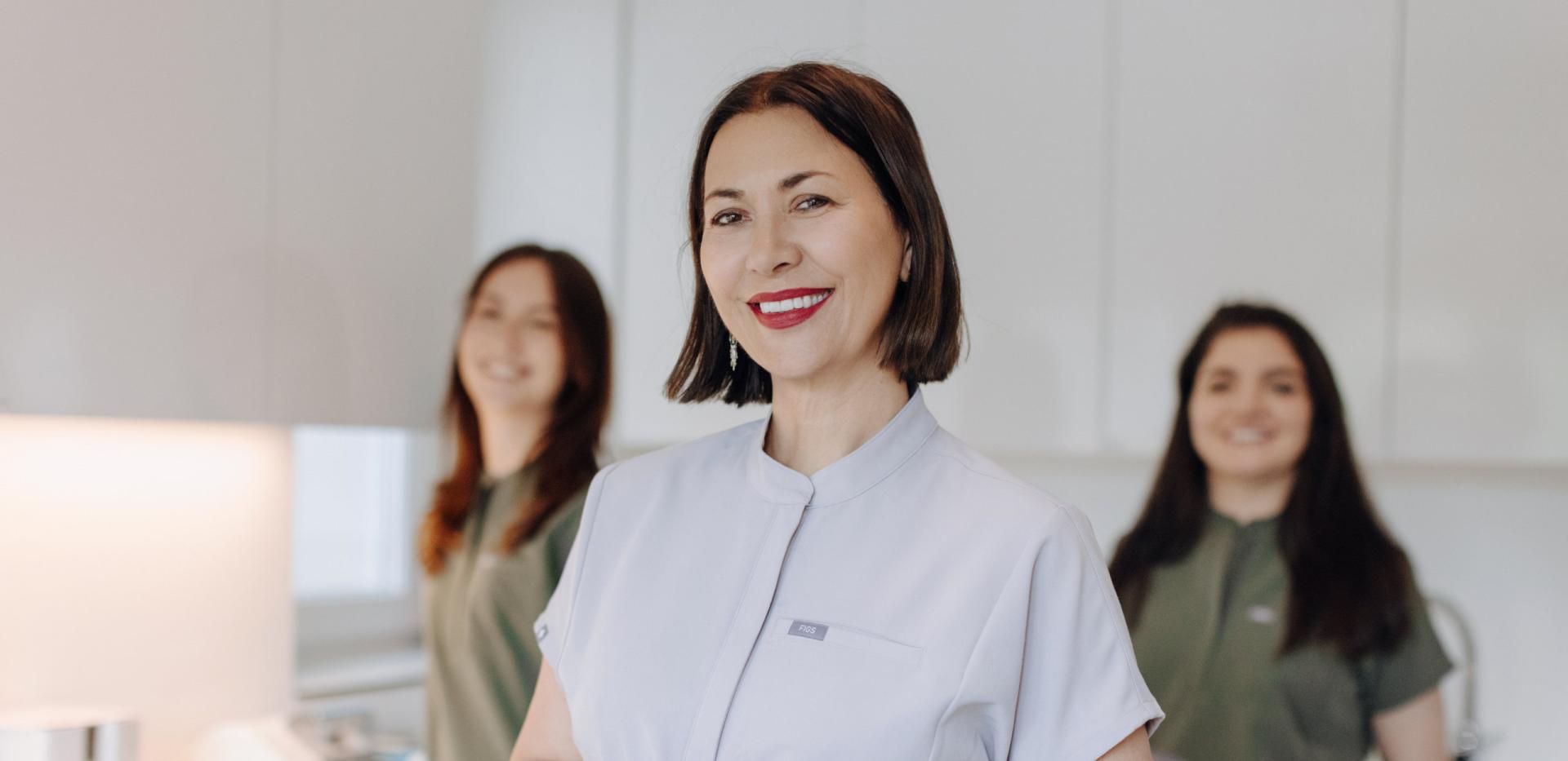 Tim okuplja doktore dentalne medicine, specijalista oralne kirurgije te dentalne asistente i higijeničarke. Dr. Sanja Vuić dodatno se educirala kroz međunarodne programe iz estetske stomatologije i estetske ortodoncije, uključujući certifikate za Invisalign, Inman Aligner, ClearSmile Aligner i Six Month Smiles. U kliničkom dijelu sudjeluje i dr. Ivica Knežević, specijalist oralne kirurgije, s iskustvom rada na implantološkim sustavima Ankylos, MIS i NobelBiocare, dok higijeničarke s iTOP edukacijom Curaprox naglašavaju individualne upute za kućnu higijenu.